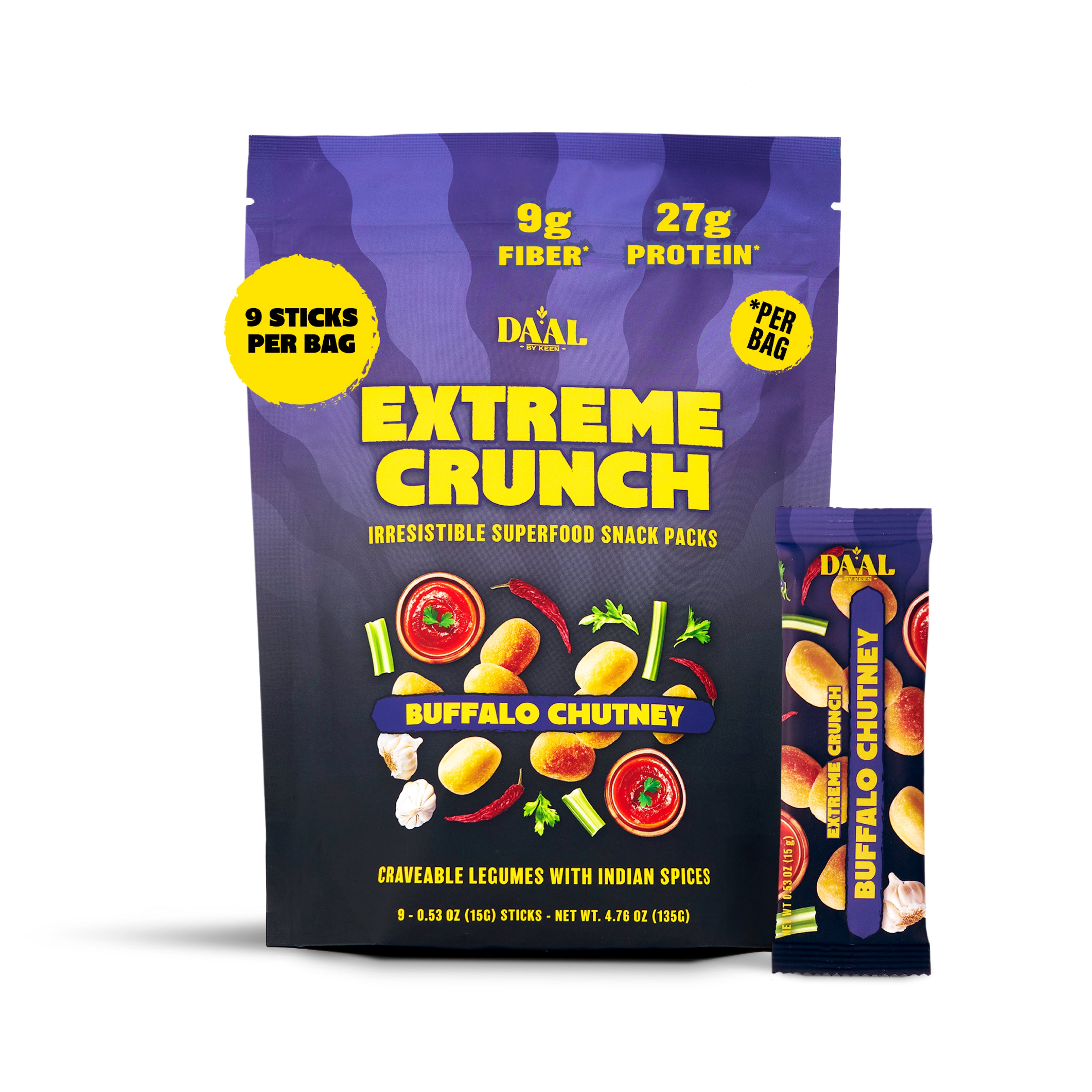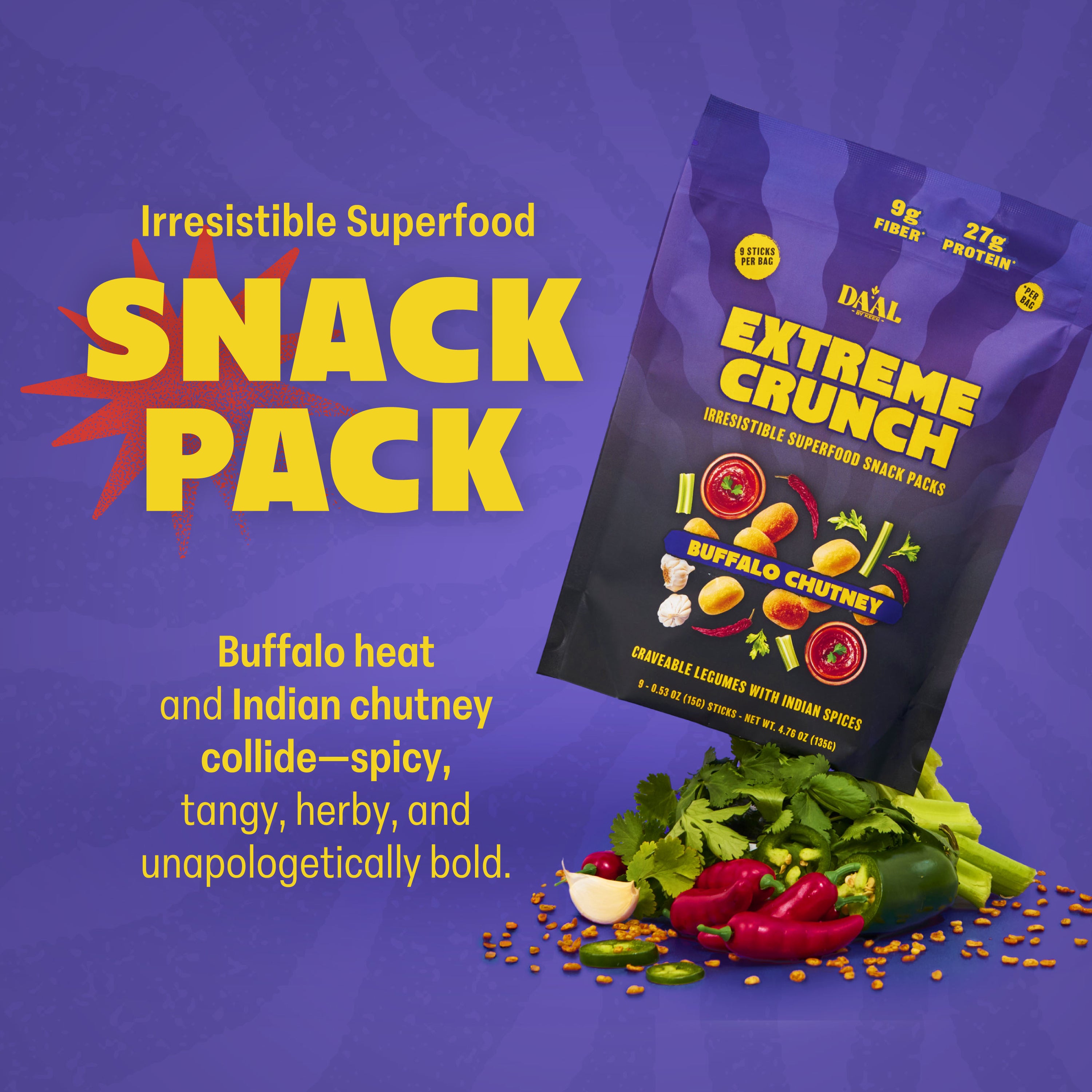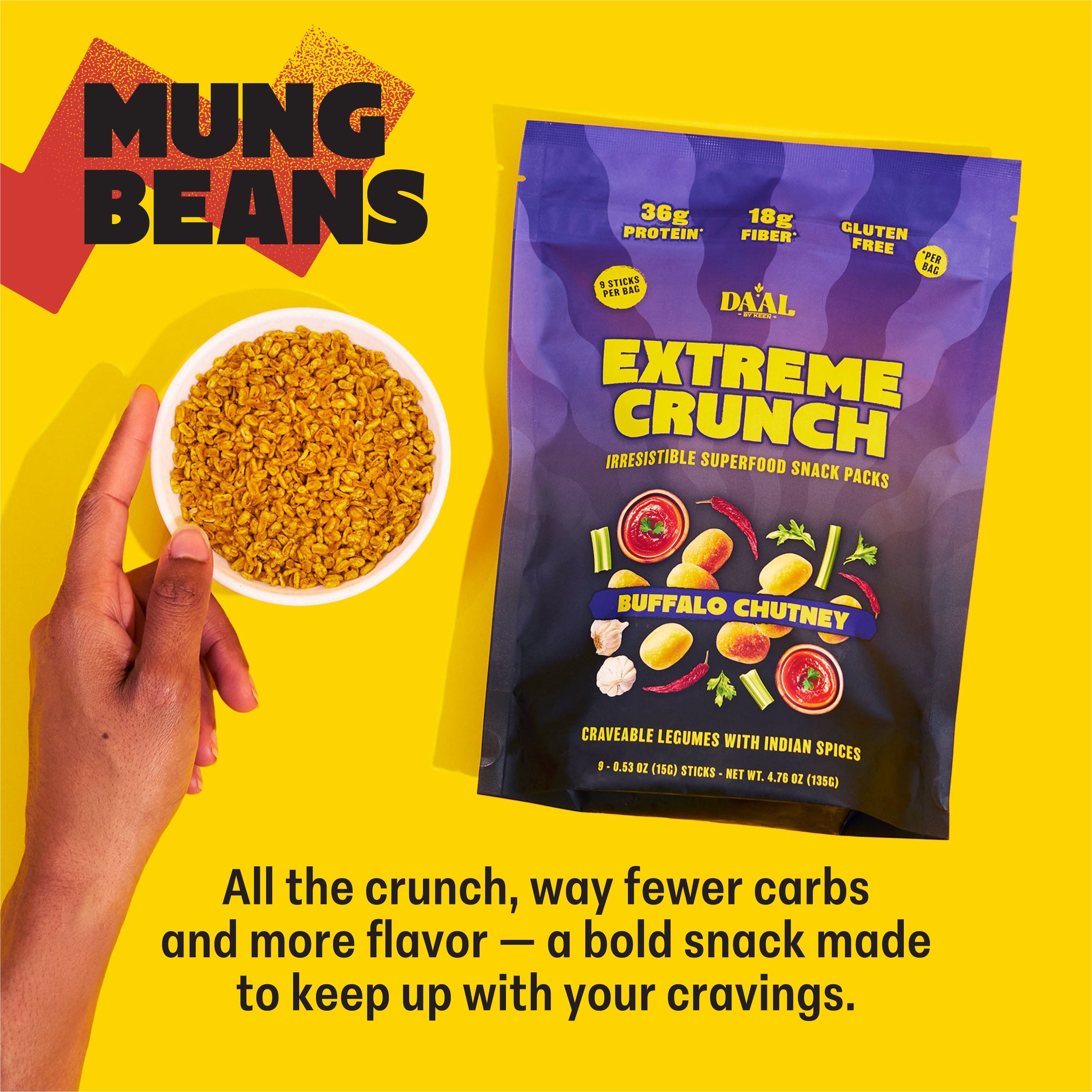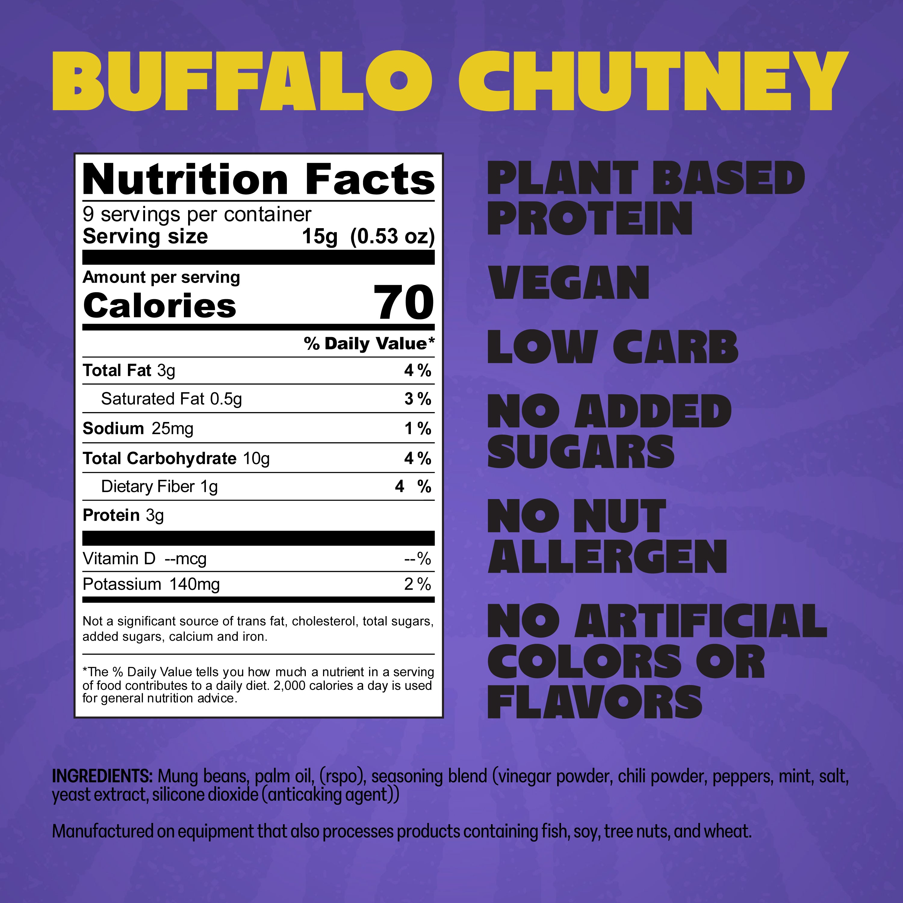 Spicy, herby and tangy umami flavors blended together to create an unbeatable spice blend that boasts the richness of buffalo sauce paired with bright, earthy Indian green chutney. We've turned mung beans into a crispy, delicious snack to be enjoyed any time of day when the snack craving hits.